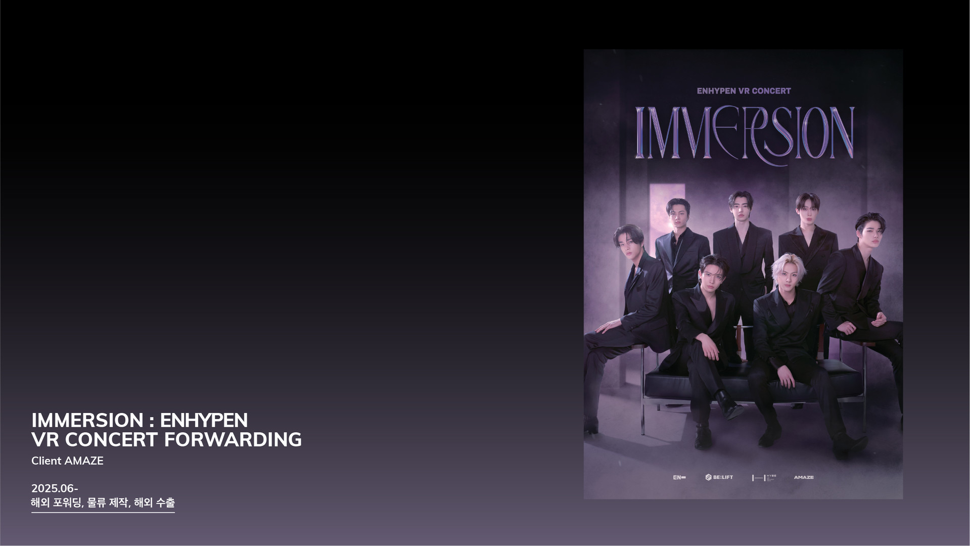 2025 ENHYPEN VR 콘서트 [IMMERSION] 프로젝트는 AmazeVR 주최 하에 전 세계 팬덤을 대상으로 VR 콘서트의 몰입감을 오프라인 관람 경험으로 확장하는 고품질 입장 특전 제작 및 글로벌 납품을 목표로 진행되었습니다.