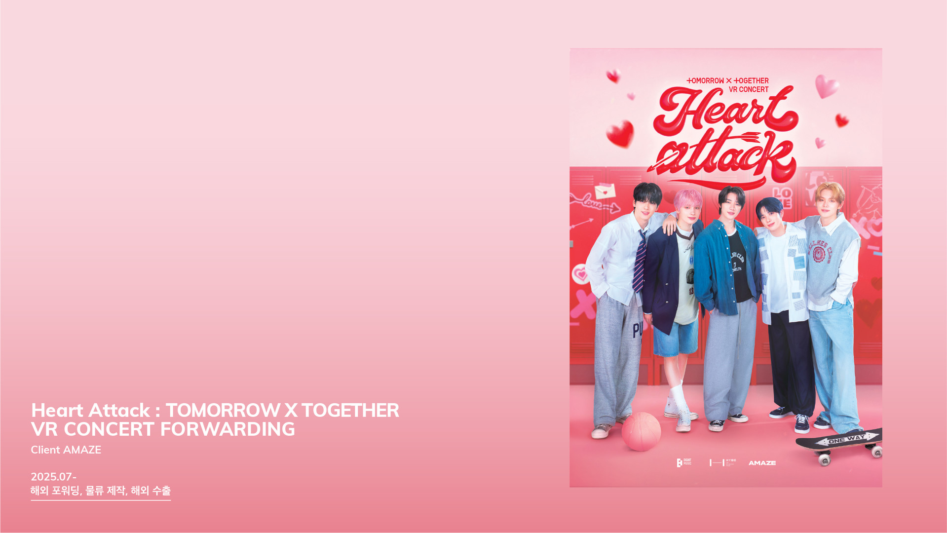 2025 AmazeVR 주최 [TOMORROW X TOGETHER VR CONCERT : HEART ATTACK] 프로젝트는 콘셉트 기반의 티켓과 포토카드 외에도 스티커, 네컷포토 등 신규 품목을 도입하여 특전 구성의 다양성이 확장 되었으며, 국가별 상영 일정에 맞춘 물류 대응 전략을 이원화하여 각 시장에 최적화된 공급 플랜을 수립한 프로젝트 입니다.